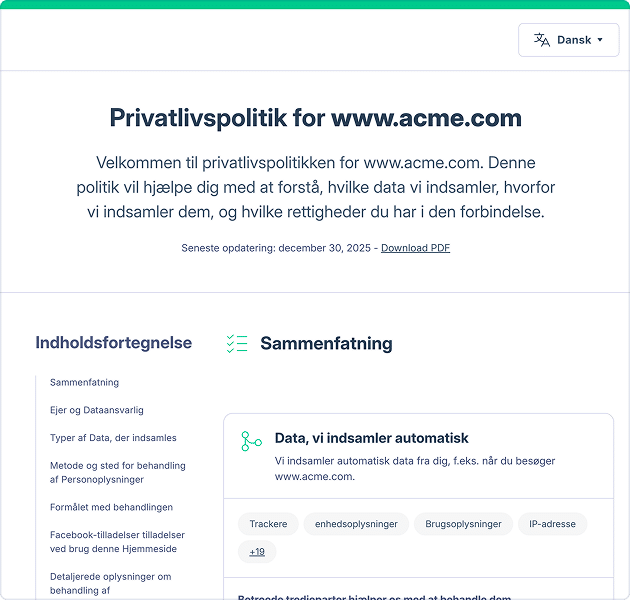 Advokatudarbejdede klausuler, der giver mening for dit websted og dine tjenester, altid opdateret til at afspejle de nyeste regler. Fås på op til 27 sprog.