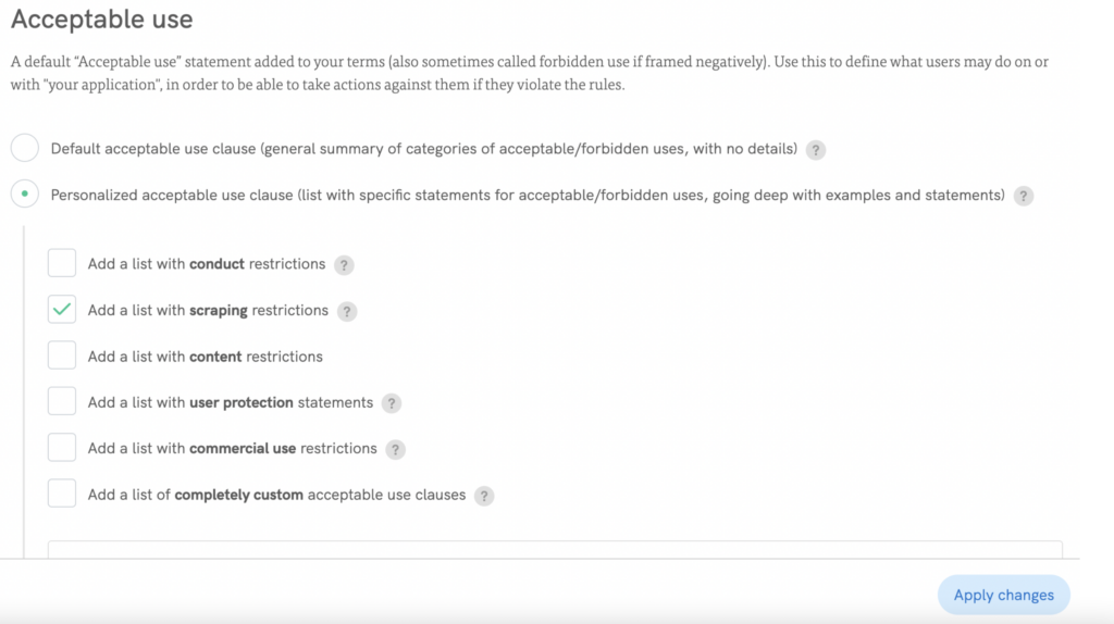 🚀 Tilføj nemt en klausul mod skrabning: Acceptabel brug → Personlig klausul om acceptabel brug (liste med specifikke udsagn om acceptable/forbudte anvendelser, der går i dybden med eksempler og udsagn) → Tilføj en liste med begrænsninger for scraping