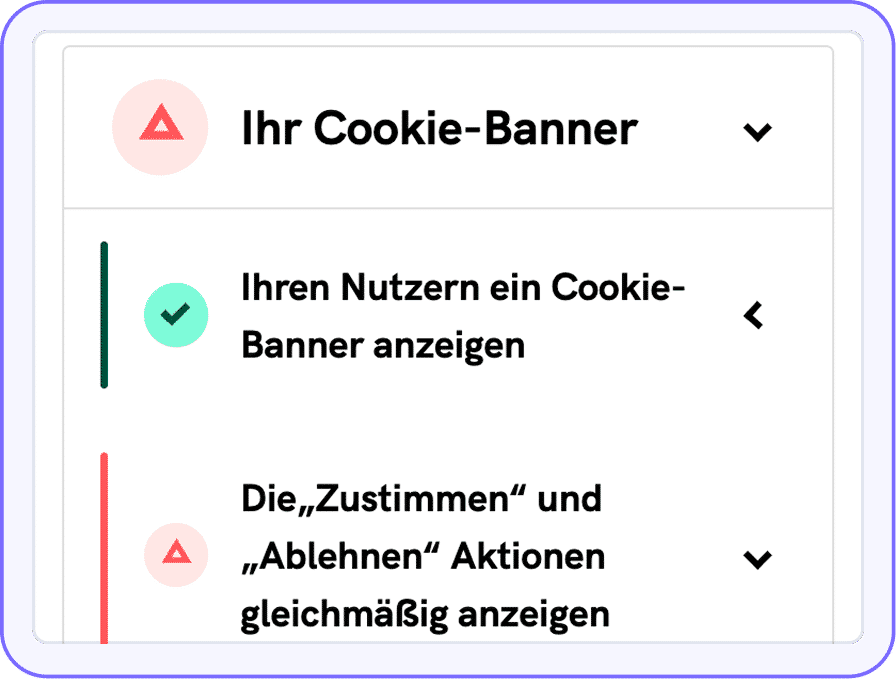 Hier finden Sie ausführliche Erklärungen und alle Ressourcen, die Sie benötigen, um Ihre nächsten Schritte zu planen. Folgen Sie den beigefügten Links, um das perfekte iubenda-Tool für jedes von uns entdeckte Problem zu finden. Beginnen Sie jetzt mit Ihrem Cookie Website Check.