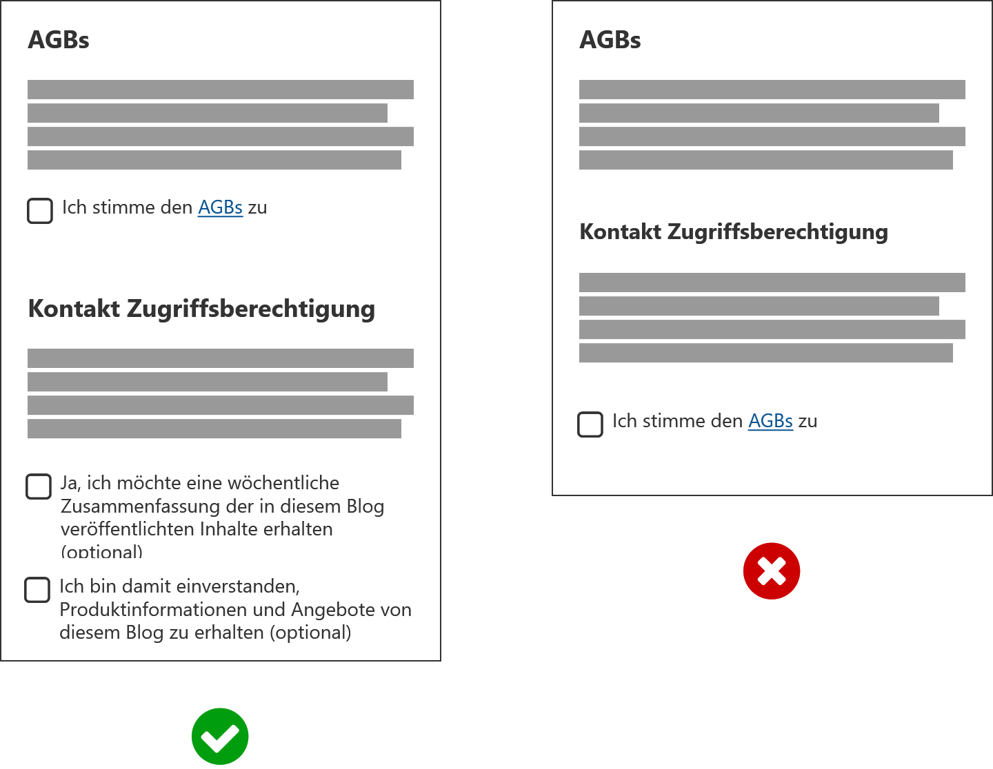 Bündeln Sie z. B. niemals Einwilligungen mit Ihren AGBs: Die Zustimmung zu AGBs und die Einwilligung zu verschiedenen Aktivitäten (z. B. das Abonnieren eines Newsletters) sind nicht dasselbe. Heben Sie diese deutlich voneinander ab und bieten Sie einzelne Opt-Ins für die Einwilligung an.