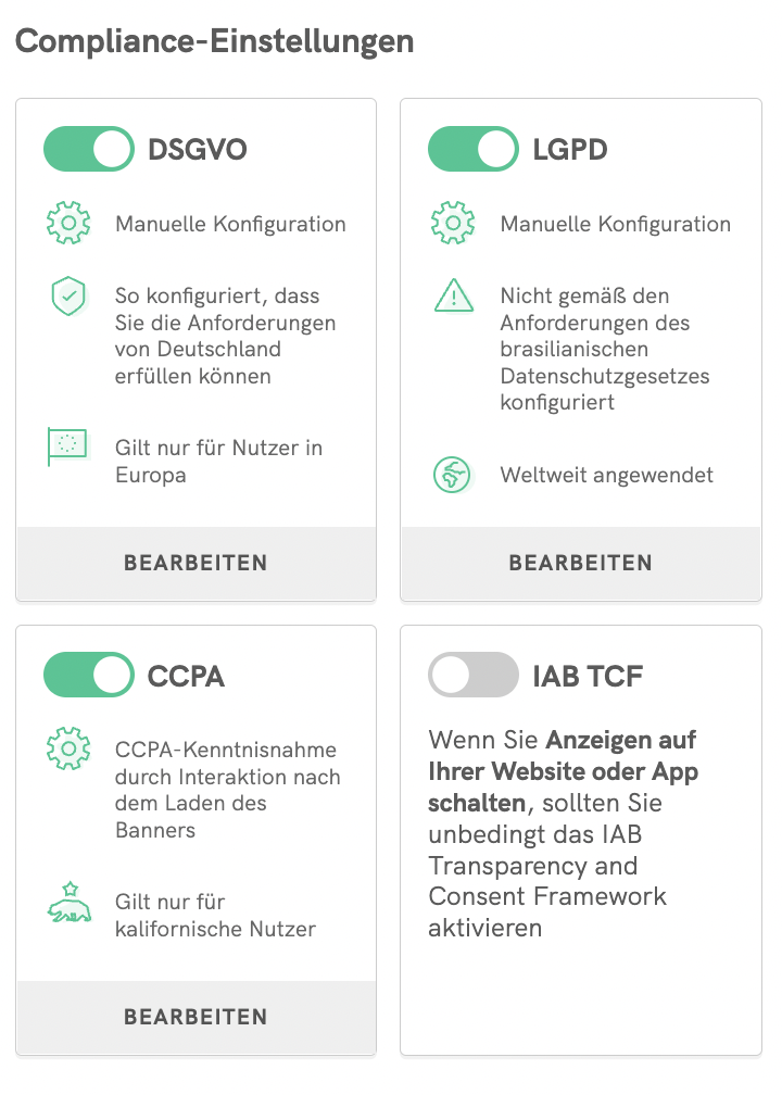 Unsere Cookie-Lösung hilft Ihnen, die Anforderungen der DSGVO, ePrivacy und mehr vollständig zu erfüllen. Sie erhalten nicht nur die komplette Kontrolle über Ihre Cookie-Banner und -Einstellungen, sondern sind dank der automatisierten DSGVO-Standardkonfiguration auch einen Schritt weiter, indem Sie die wichtigsten Punkte der Nichteinhaltung verhindern, die in der NOYB-Analyse berücksichtigt wurden. Und natürlich ermöglicht es Ihnen, die Vorschriften der DSGVO und der nationalen Datenschutzbehörden gesetzeskonform zu erfüllen.