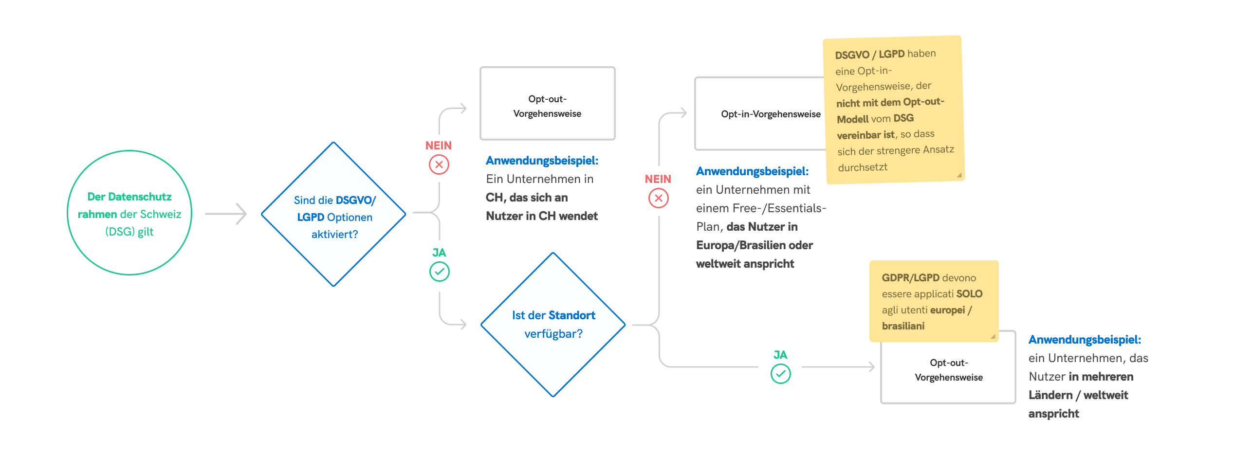Nach dem DSG stellt ein Cookie-Banner keine spezifische Anforderung dar, da der Gesetzgeber einen Opt-out-Ansatz verfolgt hat. Das bedeutet, dass Sie in den meisten Fällen Verarbeitungstätigkeiten auf der Grundlage von Cookies oder ähnlichen Technologien durchführen können, ohne die vorherige Einwilligung der Nutzer einzuholen, und zwar bis zu dem Zeitpunkt, an dem die Nutzer beschließen, ihre Einwilligung zu einer solchen Verarbeitung ausdrücklich zu verweigern.