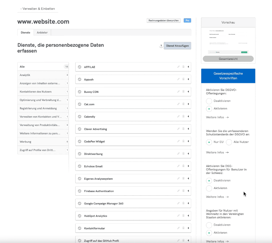 Bitte beachten: Selbst wenn Sie nicht verpflichtet sind, andere Gesetze als das DSG einzuhalten (d. h. Sie und Ihre Zielnutzer sind ausschließlich in der Schweiz ansässig), Sie es aber dennoch vorziehen, eine vorherige Einwilligung zur Verwendung von Cookies und ähnlichen Technologien anzuwenden, bietet Ihnen unsere Lösung eine solche Option, die wahrscheinlich auch von der Schweizer Datenschutzbehörde bevorzugt wird.