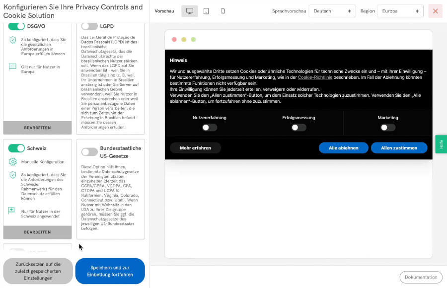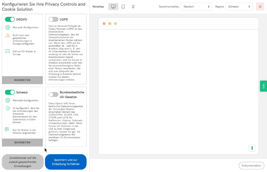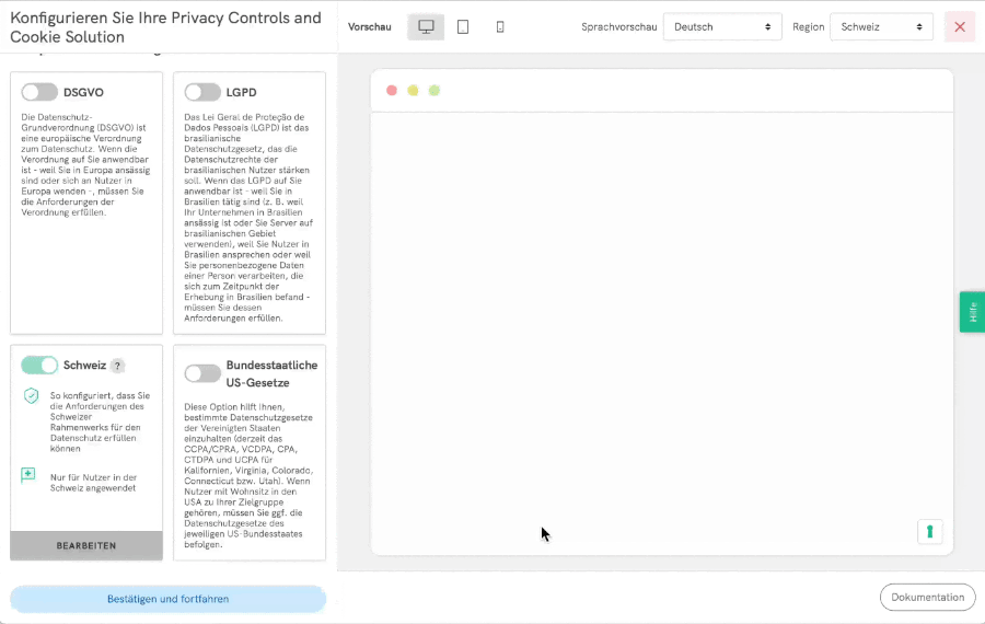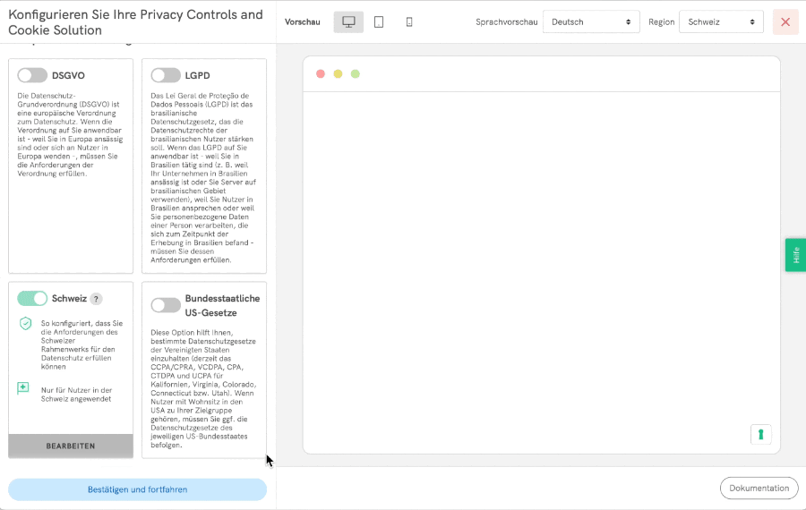 Aktivieren Sie im Generator für Privacy Controls and Cookie Solution einfach die Option Schweiz .
