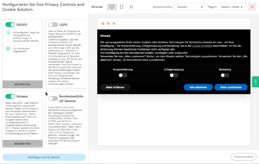 Bitte beachten: Wenn Sie es vorziehen, eine vorherige Einwilligung zur Verwendung von Cookies und ähnlichen Technologien anzuwenden, bietet Ihnen unsere Lösung eine solche Option, die wahrscheinlich auch von der Schweizer Datenschutzbehörde bevorzugt wird. Sie können dies tun, indem Sie die DSGVO- (oder LGPD-) Kachel in der Ansicht Compliance-Einstellungen der Privacy Controls and Cookie Solution aktivieren (lesen Sie den folgenden Absatz für weitere Anleitungen).