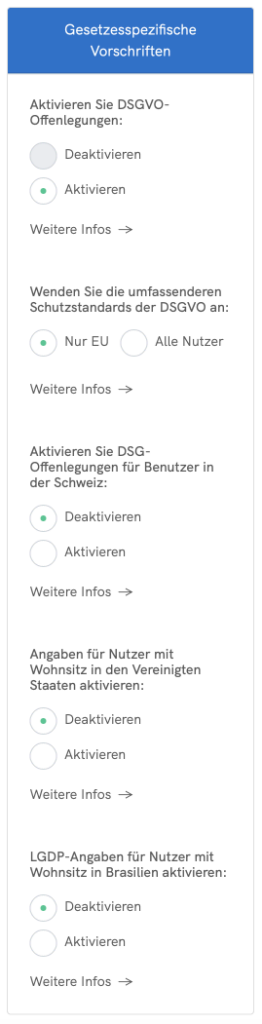 ❓ Was kann ich tun, wenn ich andere Gesetze einhalten muss, die eine vorherige Einwilligung/Opt-in-Ansatz für die Verwendung von Cookies und ähnlichen Technologien vorschreiben, wie z.B. die DSGVO und LGPD?