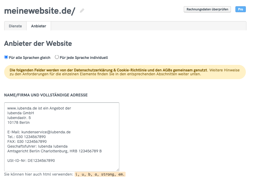 Bitte beachten Sie, dass unabhängig davon, ob Sie ein Impressum in das Feld „Website-Inhaber“ aufnehmen oder nicht – das Feld „Website-Inhaber“ muss gültige Identifizierungsinformationen enthalten (auf Englisch).