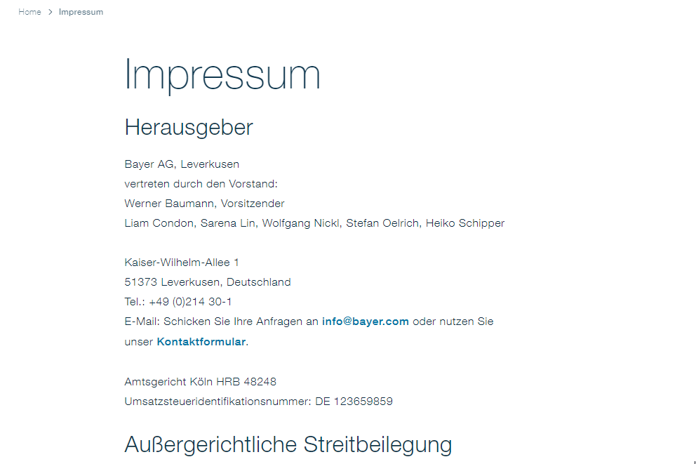 Ein gutes Beispiel für längere, aber gut strukturierte Informationen ist die Impressum-Seite von Bayer. Zum Zeitpunkt der Veröffentlichung dieses Beitrags sieht diese so aus: