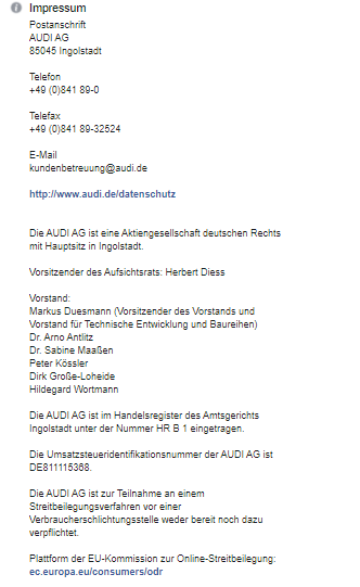 Hier ist das Impressum von Audi auf ihrer Facebook-Seite:
