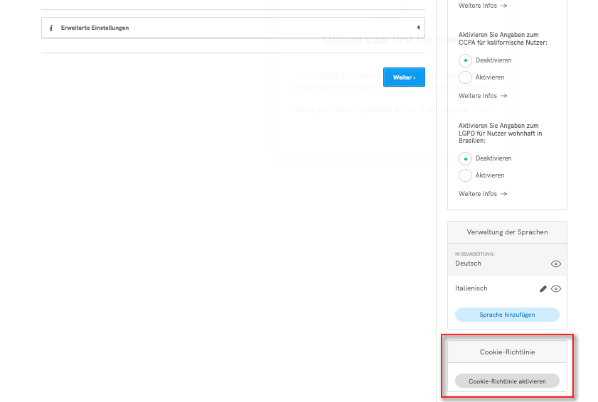 Sobald Sie Ihre Datenschutzerklärung erstellt haben, können Sie Ihre Cookie-Richtlinie aktivieren, indem Sie auf den Button Cookie-Richtlinie aktivieren klicken, den Sie unter dem Label “Cookie-Richtlinie” in der rechten Spalte vom Generator für Datenschutz- und Cookie-Richtlinien finden.