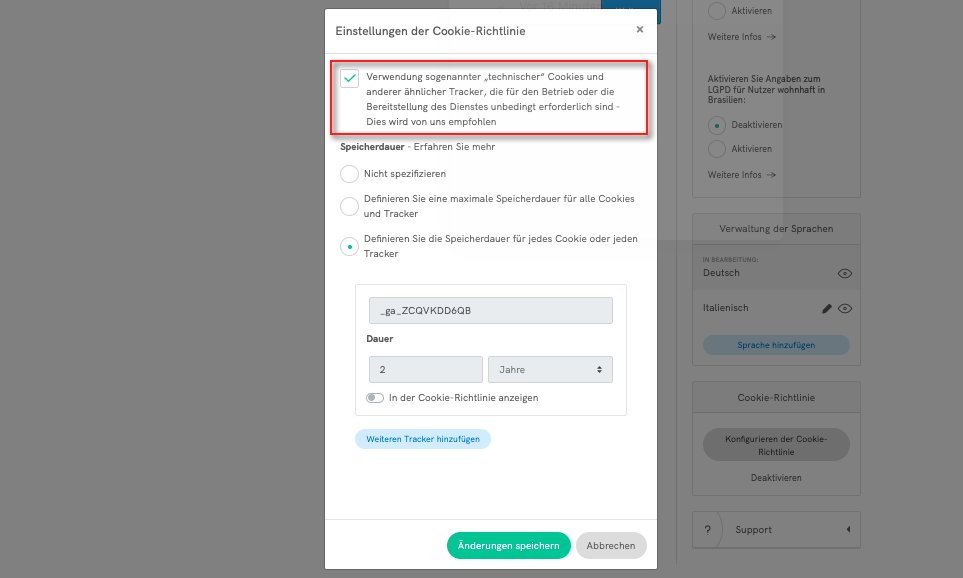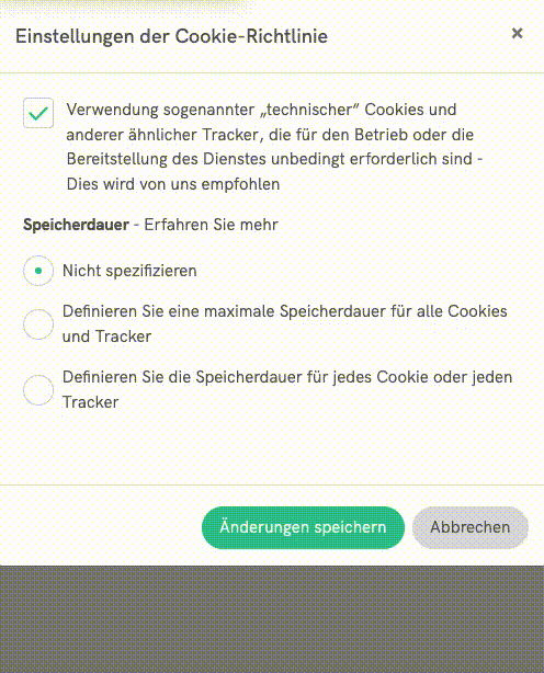 Wenn Sie technische Cookies von Erstanbietern verwenden, können Sie entweder eine allgemeine maximale Lebensdauer oder für jedes einzelne Cookie/Tracker eine Lebensdauer in Stunden, Tagen, Monaten oder Jahren angeben.