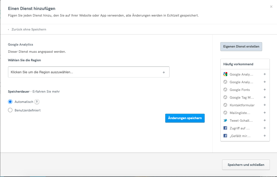 Wenn der hinzugefügte Dienst keine Anpassungen erfordert (d.h. die Art der erfassten personenbezogenen Daten, die Region usw.), verwendet der Generator beim Hinzufügen des Dienstes automatisch die Einstellung “Automatisch”. Wenn Sie die Lebensdauer von Cookies und Trackern anpassen möchten, können Sie auf den Anpassungsbutton innerhalb des entsprechenden Dienstes klicken.