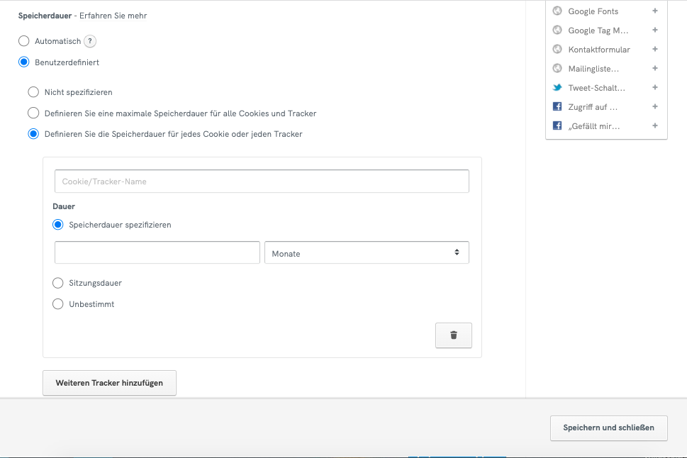 Wenn Sie die Option “Benutzerdefiniert” wählen, können Sie eine maximale Speicherdauer für alle Cookies und Tracker festlegen oder eine Speicherdauer für jedes einzelne Cookie oder Tracker definieren: