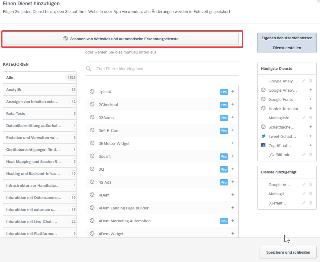 In der Box mit den Scanergebnissen können Sie alle Dienste überprüfen, die in Ihren Dokumenten fehlen, bereits ausgewählt sind und hinzugefügt werden können.