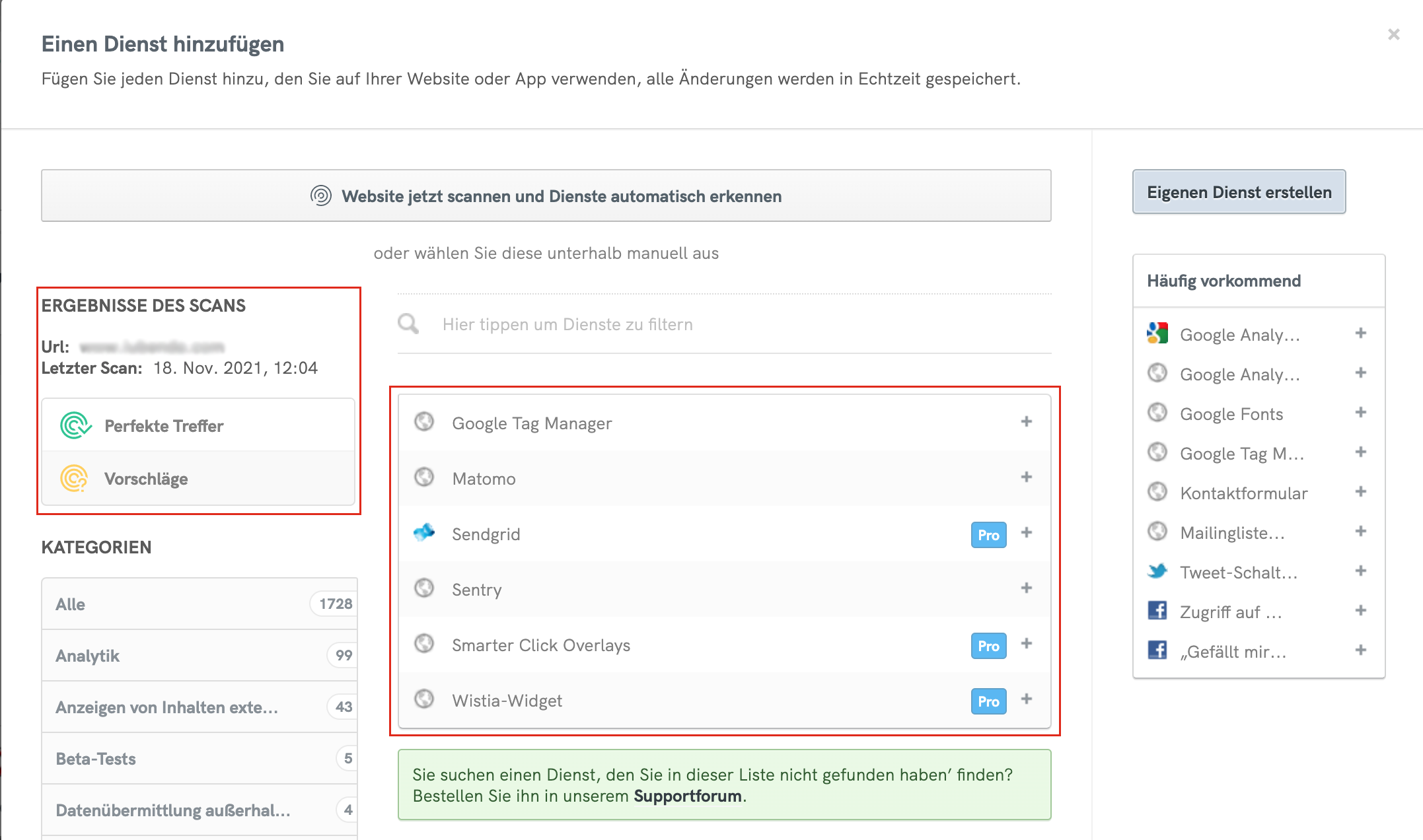 In der Box mit den Scanergebnissen können Sie alle Dienste überprüfen, die in Ihren Dokumenten fehlen, bereits ausgewählt sind und hinzugefügt werden können.