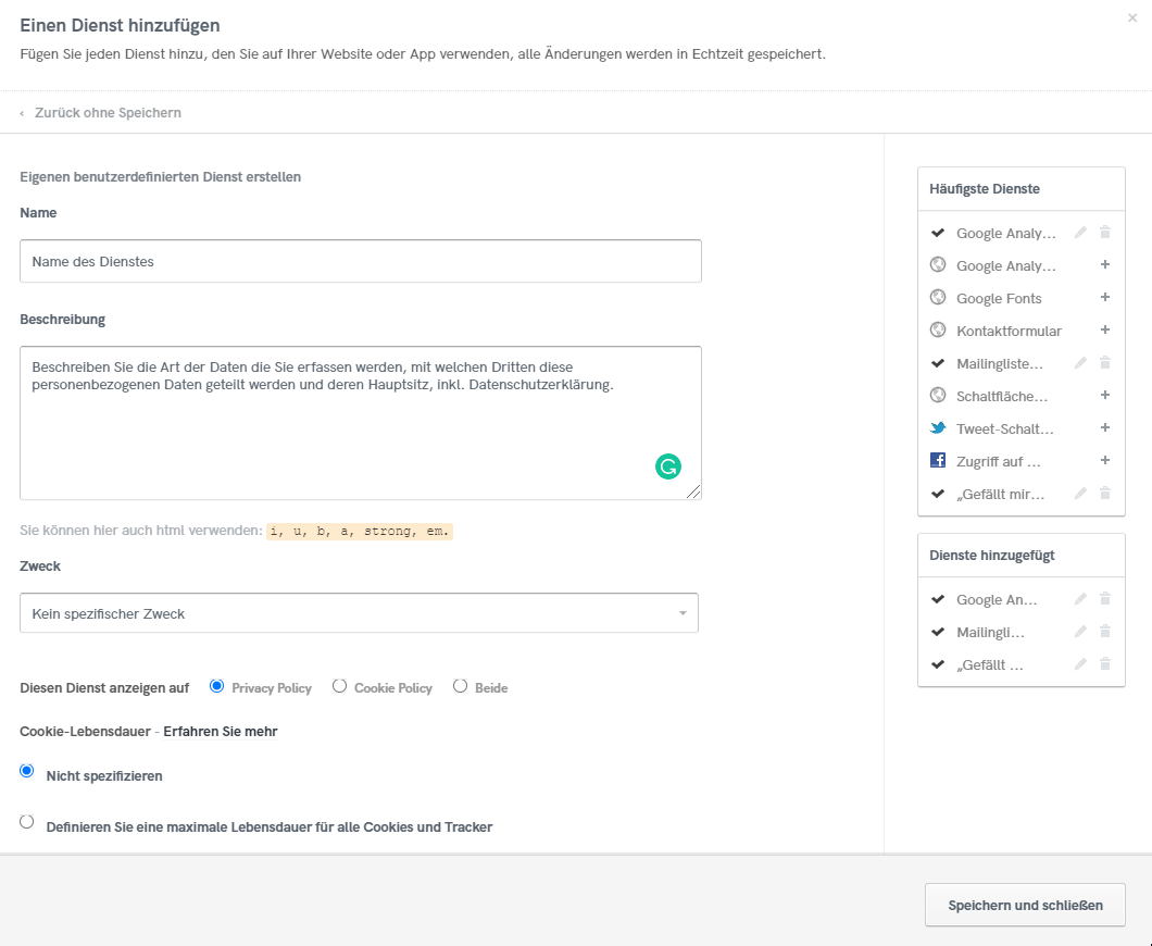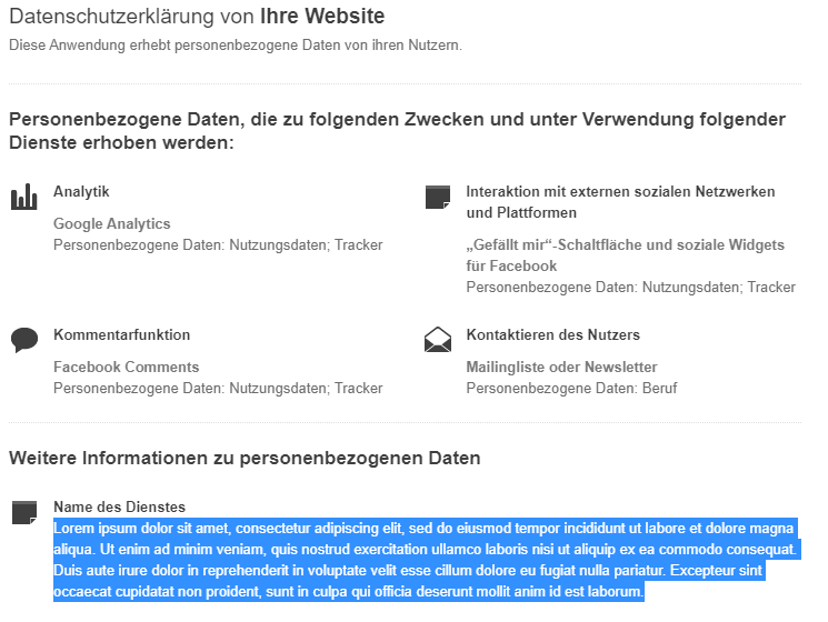 Wie bei den anderen vorgefertigten Diensten wird auch der benutzerdefinierte Dienst automatisch in den Text der Datenschutzerklärung integriert.