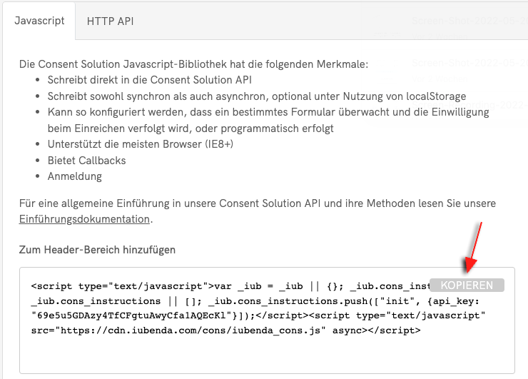 Der obige Code ist nur ein Beispiel. Bitte stellen Sie sicher, dass Sie Ihren eigenen Consent Database-Code verwenden, da der Code für Ihre spezielle Website zugeschnitten ist. Sie finden Ihr Code-Snippet unter Dashboard > [Bereich Ihrer Website] > Consent Database > EINBETTEN. Kopieren Sie dort einfach die gewünschten Informationen.