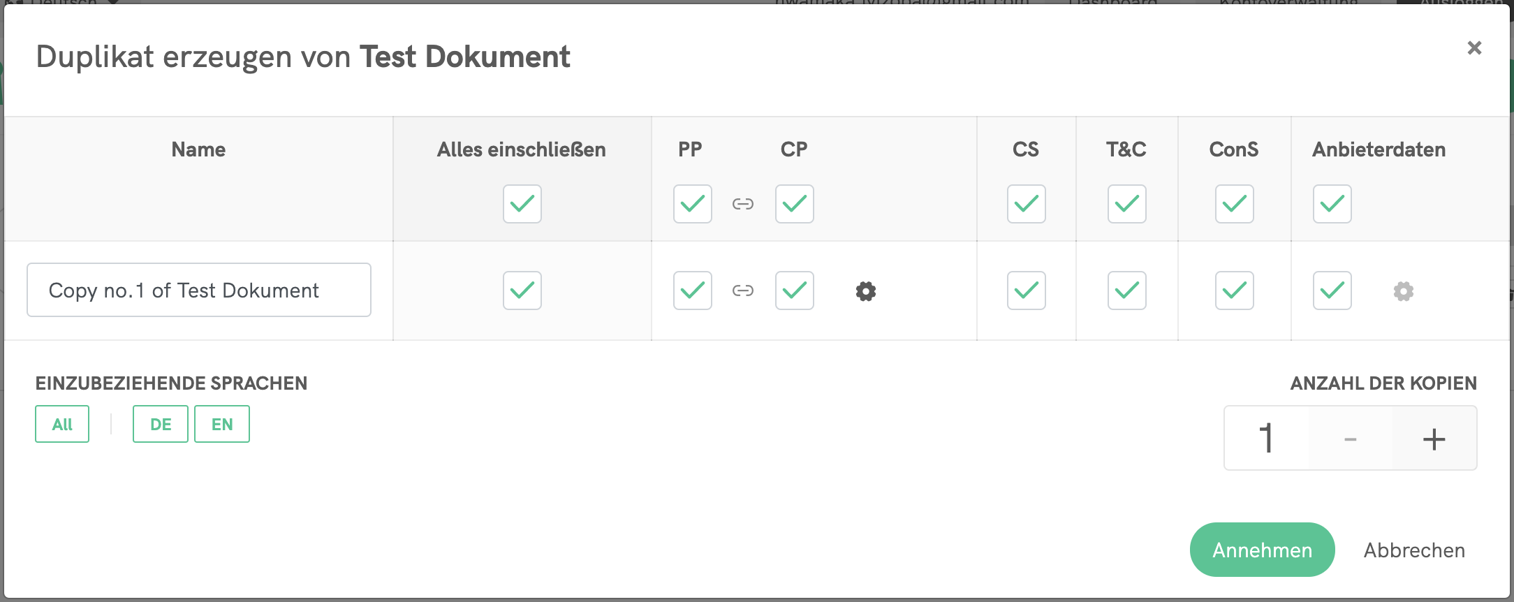 - gehen Sie auf Ihre Website/App-Seite (Dashboard > [Ihre Website]) und klicken Sie auf den Button Duplizieren (neben dem Papierkorbsymbol).