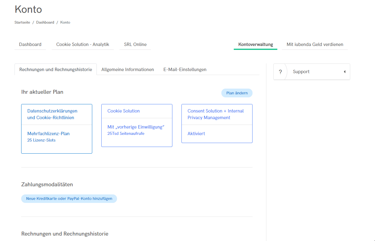 Öffnen Sie den Bereich Kontoverwaltung in Ihrem iubenda-Konto und klicken Sie auf den Button Plan ändern. Dies sollte Ihnen alle notwendigen Optionen bieten: