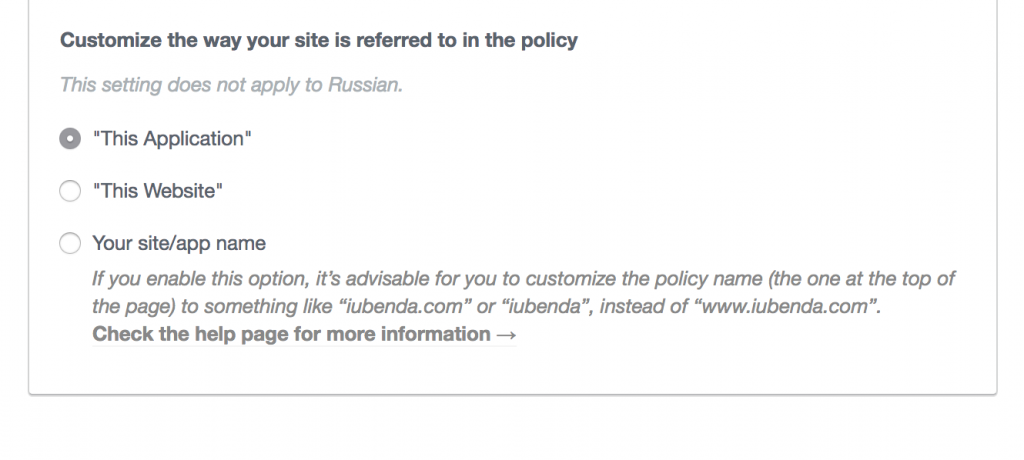 Bei mehrsprachigen Dokumenten, die Russisch einschließen, wird Russisch nur die Formulierung “diese Applikation” beibehalten, während alle anderen der Wahl folgen, die Sie in der iubenda-Oberfläche getroffen haben.