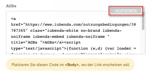 Wenn Sie den Code direkt kopieren, wird das iubenda-Styling (Schriftarten usw.) weiterhin auf Ihr Dokument angewendet. Wenn Sie möchten, dass das Dokument das Styling direkt von Ihrer Website übernimmt, wählen Sie hier die White-Label-Option.