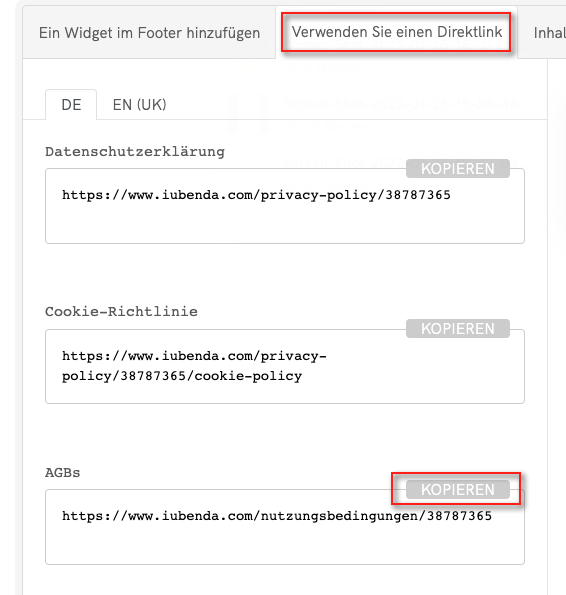 Klicken Sie im Einbettungsbereich auf Ein Widget im Footer hinzufügen, scrollen Sie zu den AGBs und klicken Sie auf KOPIEREN.
