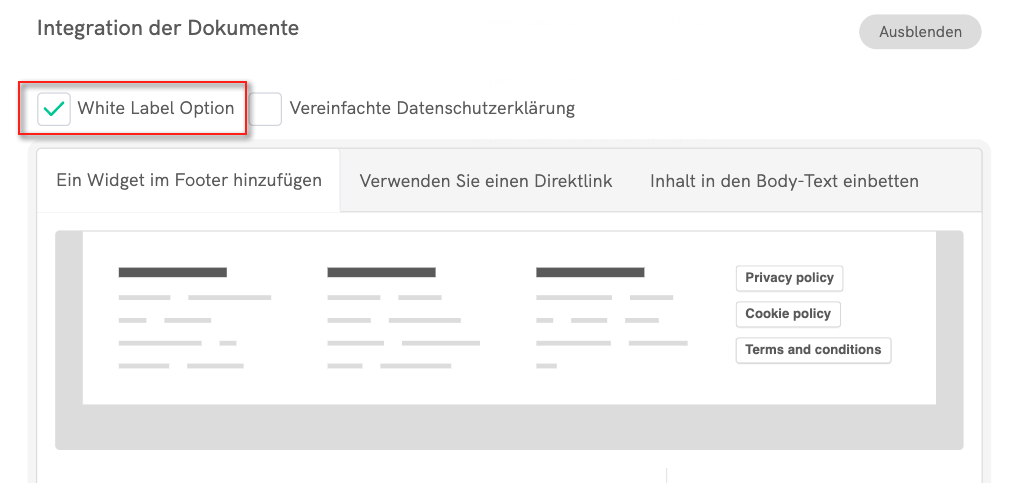 Wenn Sie den Code direkt kopieren, wird das iubenda-Styling (Schriftarten usw.) weiterhin auf Ihr Dokument angewendet. Wenn Sie möchten, dass das Dokument das Styling direkt von Ihrer Website übernimmt, wählen Sie hier die White-Label-Option.