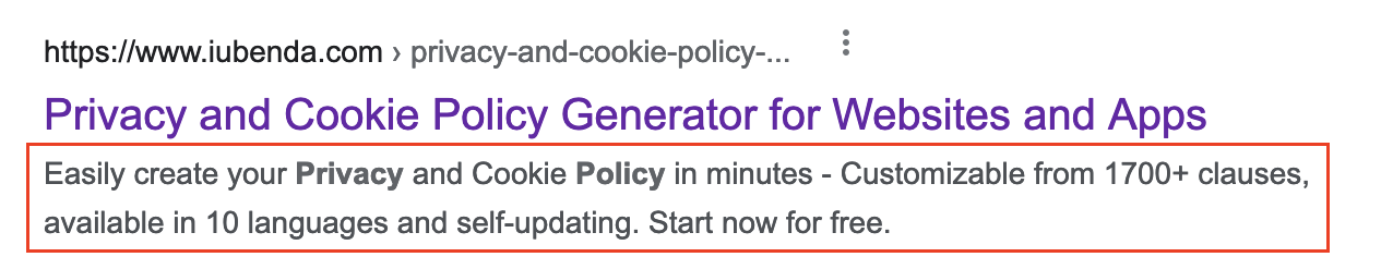 - Add a meta title and meta description: these meta tags will help you with SEO. The meta title is simply the title you give to your page, while the meta description is what you see on search engines. Make sure they’re not too long and that they reflect the content of your page. Here’s an example:
