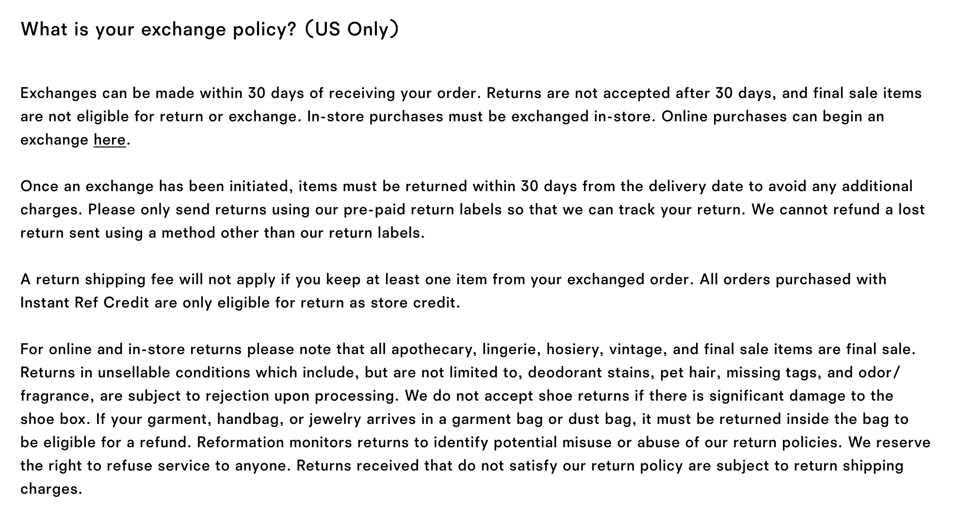 The US clothing brand Reformation has an exchange policy exclusively for US consumers. As you can see below, it contains all the details regarding how products must be returned to get an exchange.