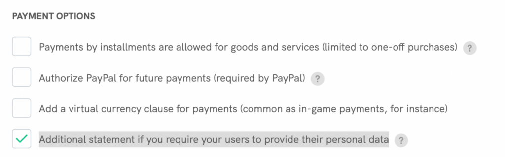 Finally, scroll down to Purchasing process and under Payment options tick the box next to Additional statement if you require your users to provide their personal data.