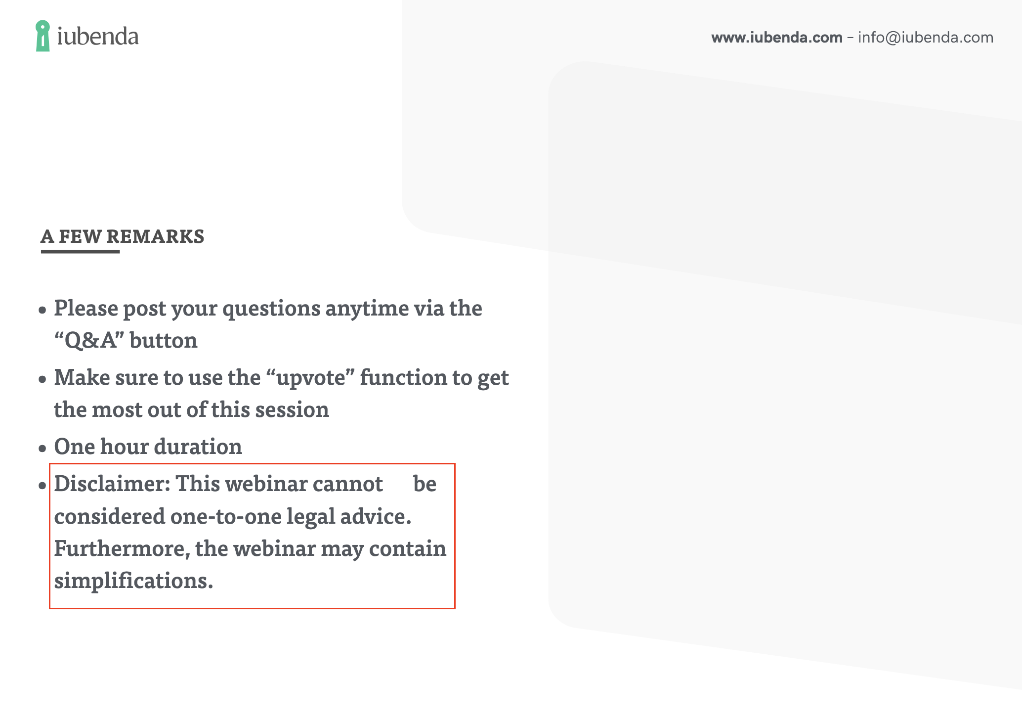 For example, the disclaimer below is taken from one of our webinars. We often host webinars for our users, to help them have a better understanding of legal compliance. However, these webinars are not legal advice, they’re purely informative, so we make sure to specify that.