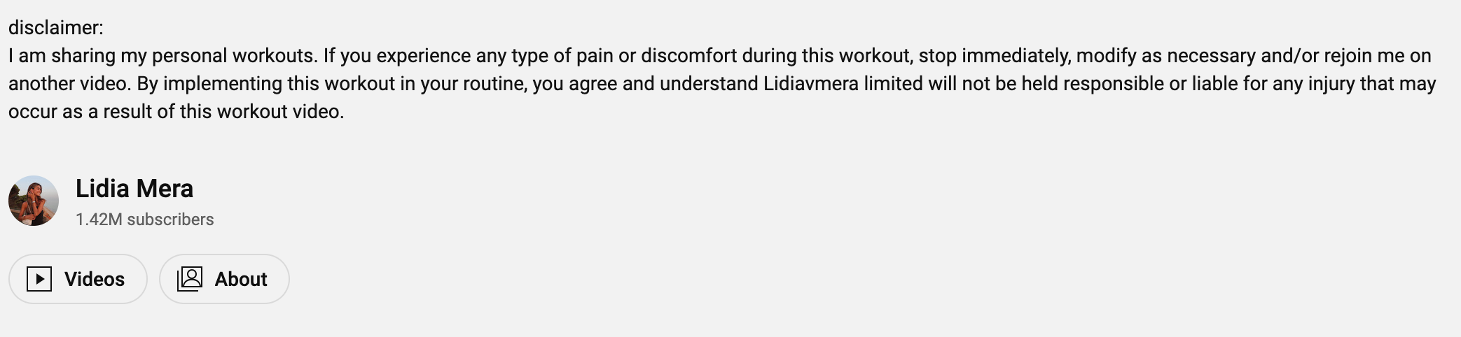 For example, let’s imagine you are a personal trainer who shares workout videos on YouTube. Your subscribers may follow your workouts and one of them could get injured as a result. A no-responsibility disclaimer can provide a good layer of protection here. In the description of your videos, you could add something like: