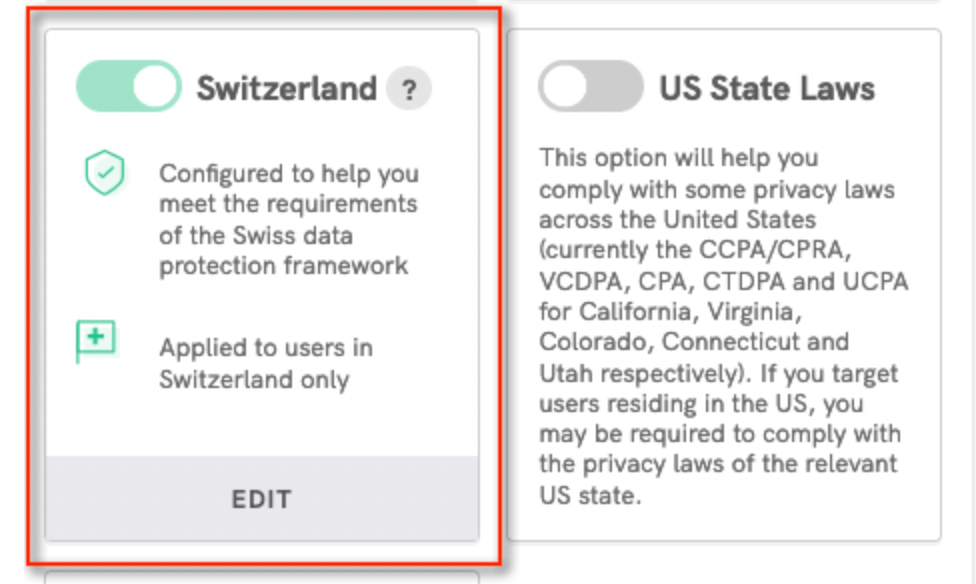 First things first, ensure that the “Switzerland” tile is activated on your iubenda dashboard.