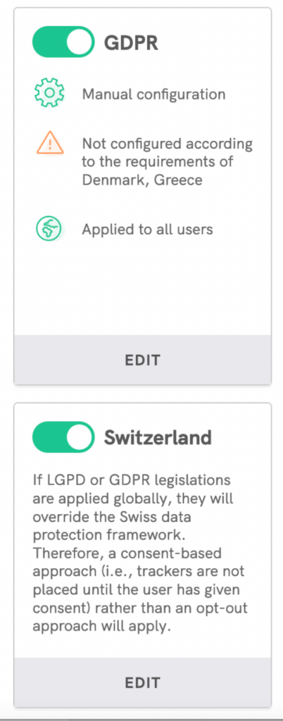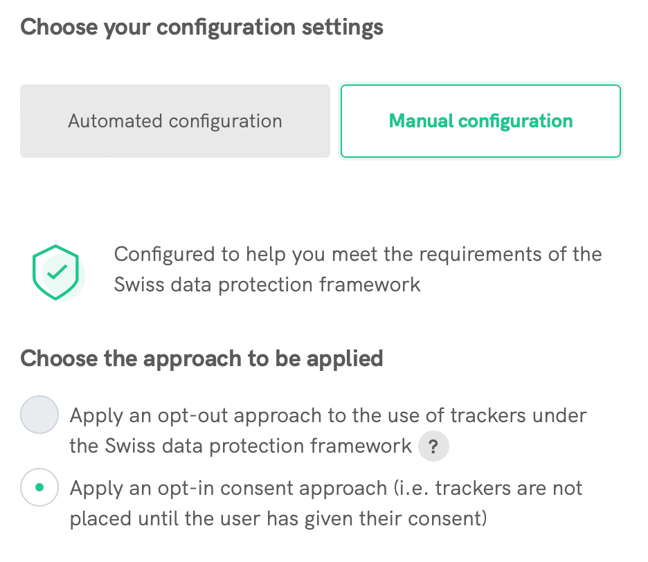 To apply the opt-in consent approach you need to enable the “GDPR” tile. Then, within the Switzerland title, select the manual configuration and switch to “Opt-in”.