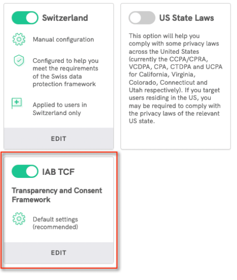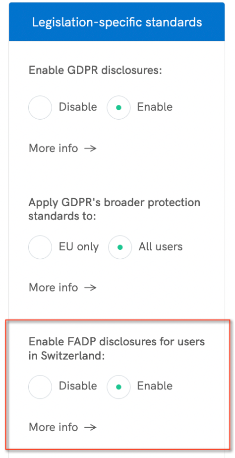 Finally, make sure you enable FADP disclosures for users in Switzerland and add all third-party services used by your website or app, such as Google Analytics, and disclose all TCF vendors you work with.
