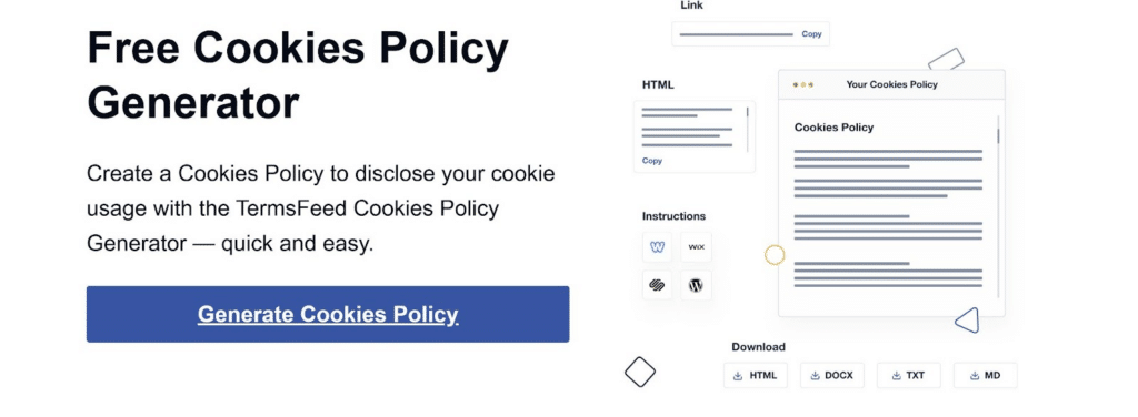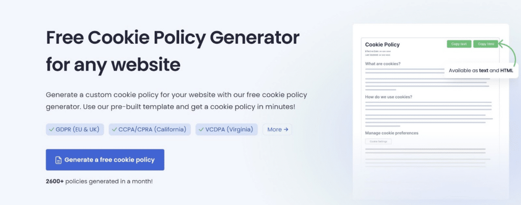 The good news is that you don’t need to write one from scratch yourself. A cookie policy generator can create one for you in minutes.