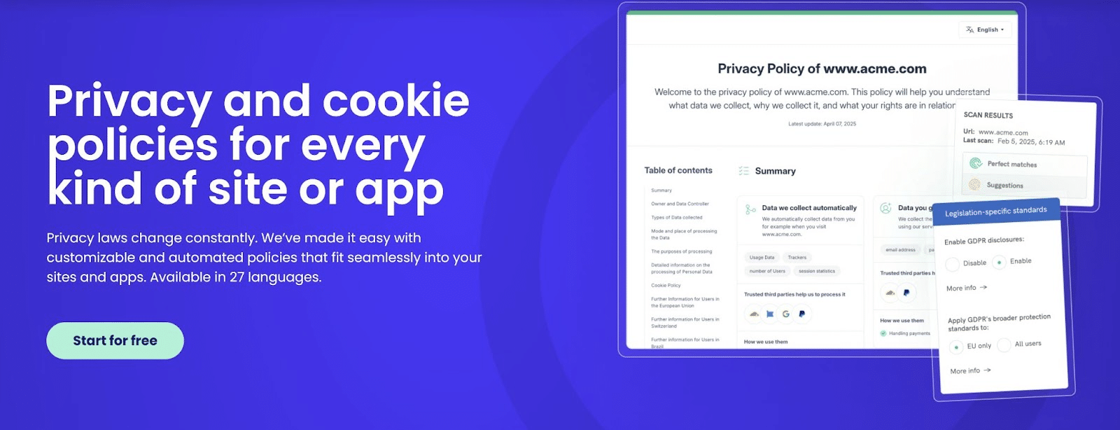 • Offers a limited free policy option that isn’t tailored for compliance with GDPR and other privacy regulations