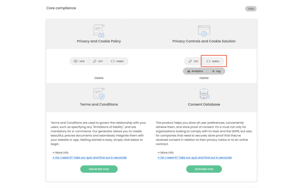 Let’s start by copying your Privacy Controls and Cookie Solution code from the Privacy Controls and Cookie Solution embed section of your iubenda account. Under the title ‘Privacy Controls and Cookie Solution’ in your dashboard select the <> EMBED button.