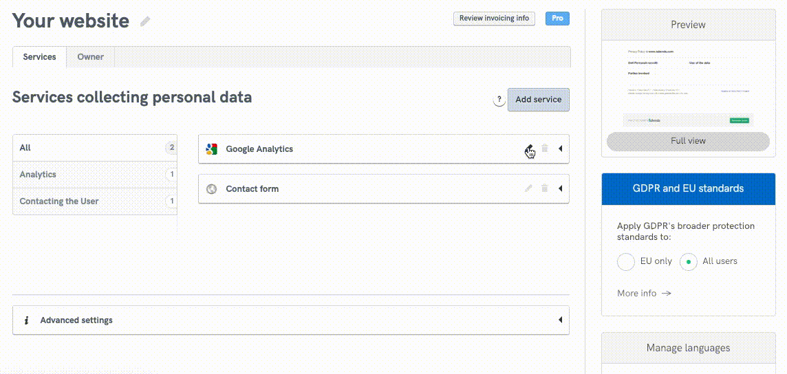 To edit, simply go to the relevant site area in your iubenda dashboard and click on the “Edit” button for your privacy policy.