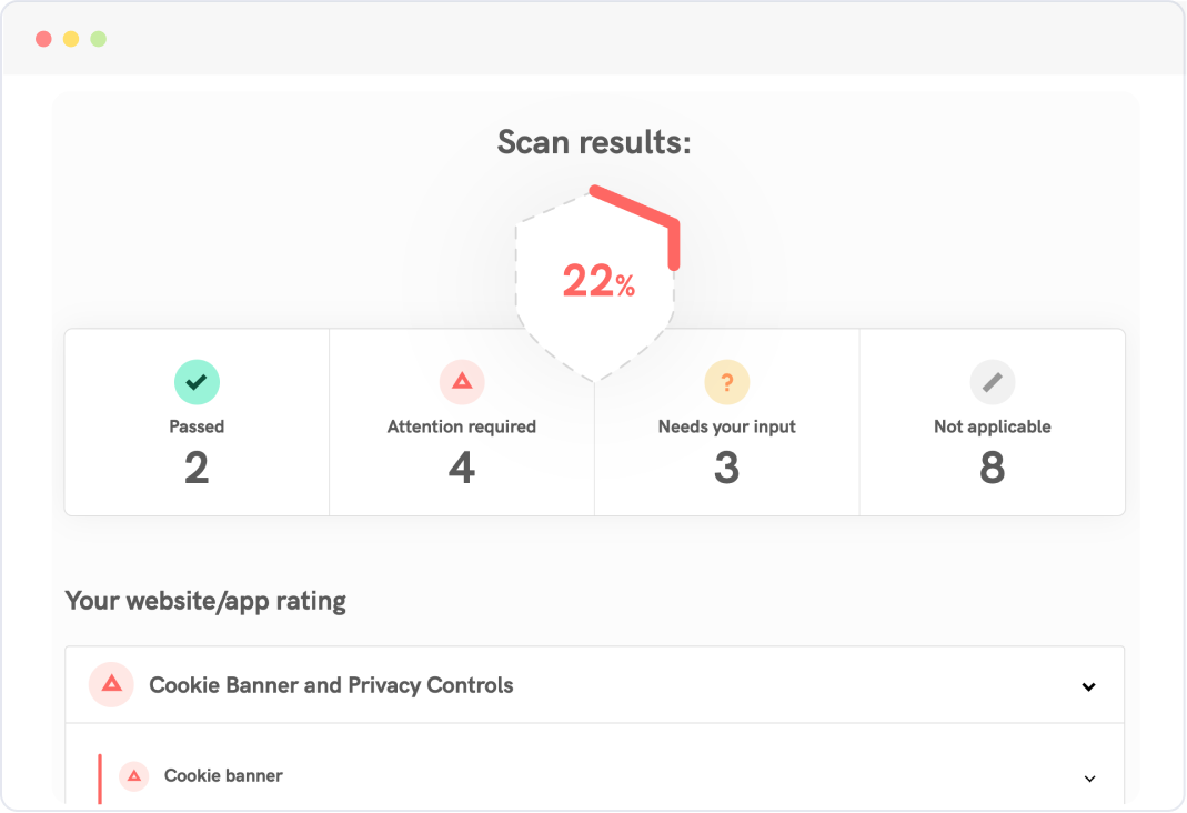 Boost your site’s compliance in a few minutes. Our smart scanner analyzes your site, identifies issues, and suggests fixes.