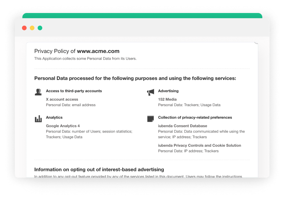 Create and customize privacy policies in minutes. Available in 15 languages and automatically updated with legal changes.