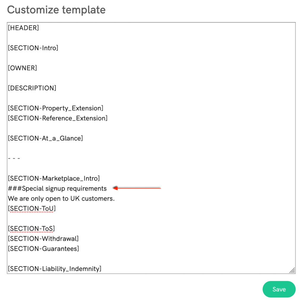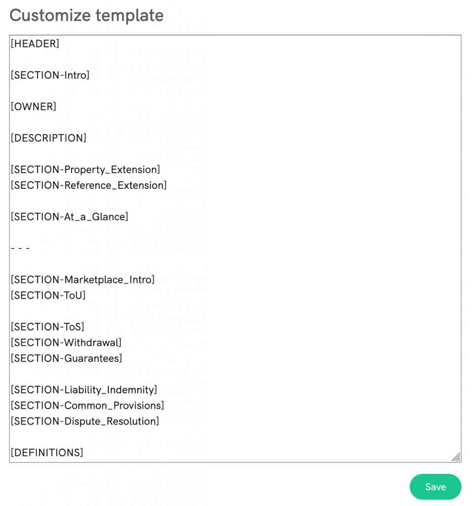 All of the shortcodes are named after the actual sections inside the T&C document and it’s therefore easy to understand where a text will show after saving it.