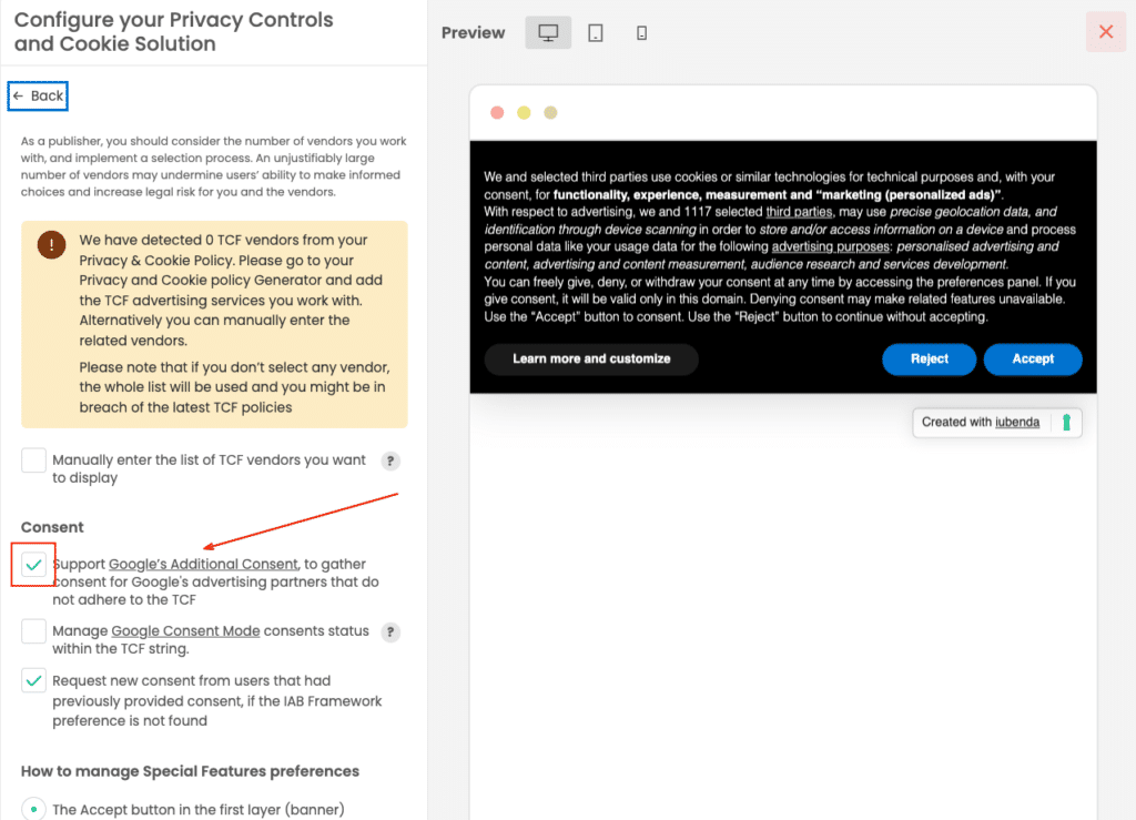 Enable Google Additional Consent from the Privacy Controls and Cookie Solution Configurator, under the IAB TCF settings. To configure the version (v1 or v2), use the configuration script below.