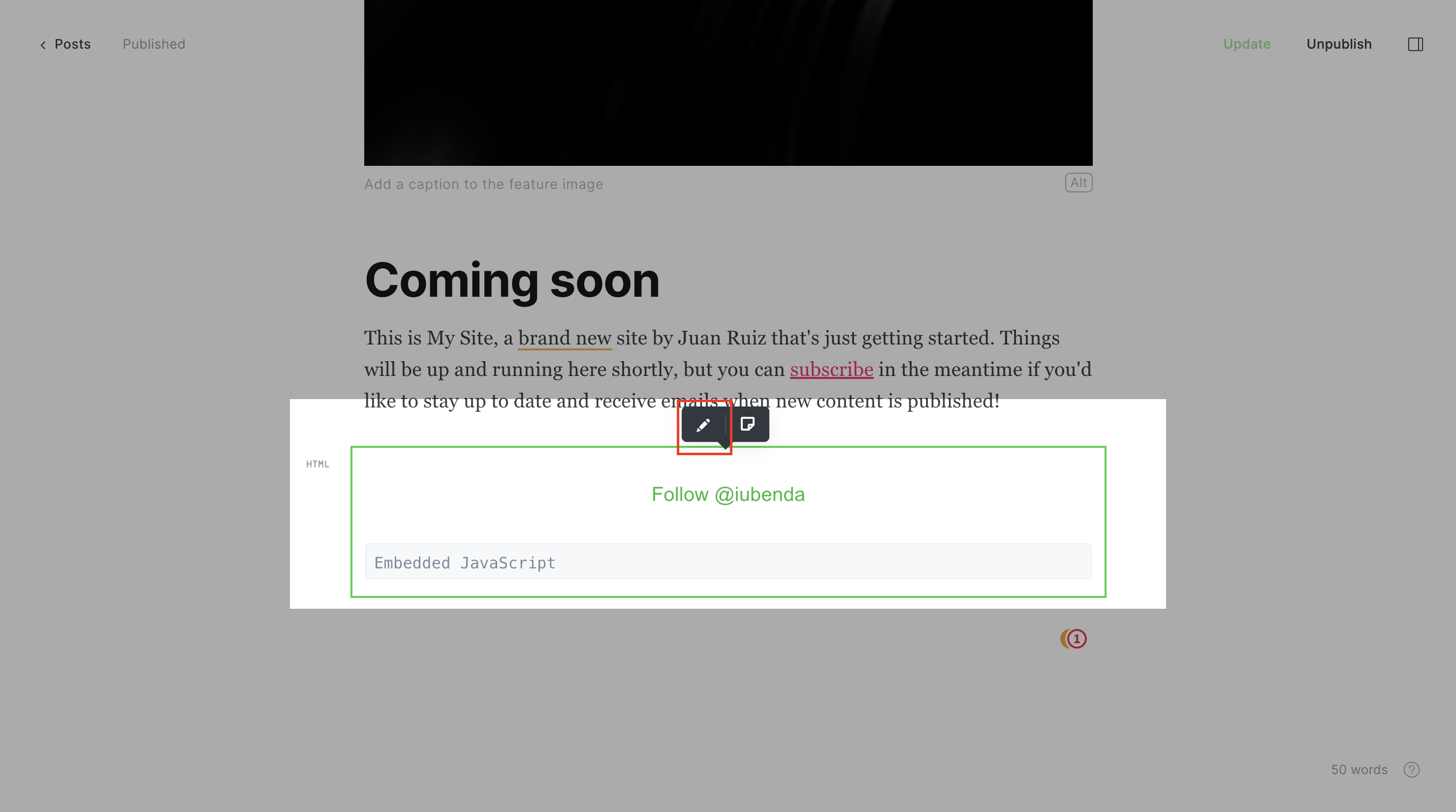 In your Ghost Dashboard, find the script you need to modify (simply search for the service you want to block, in this case, it is the Twitter follow button)