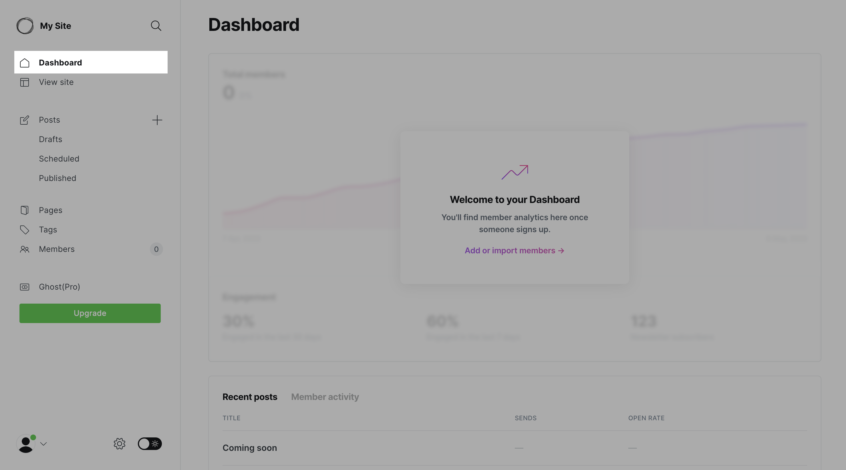 Now, head over to your Ghost account, and on the bottom left of your screen click on the settings icon.