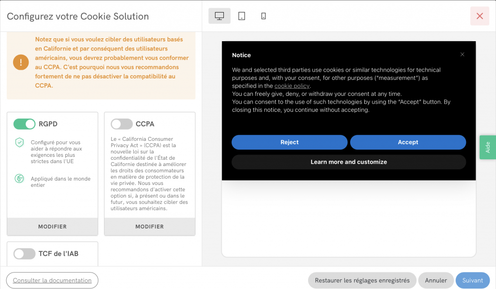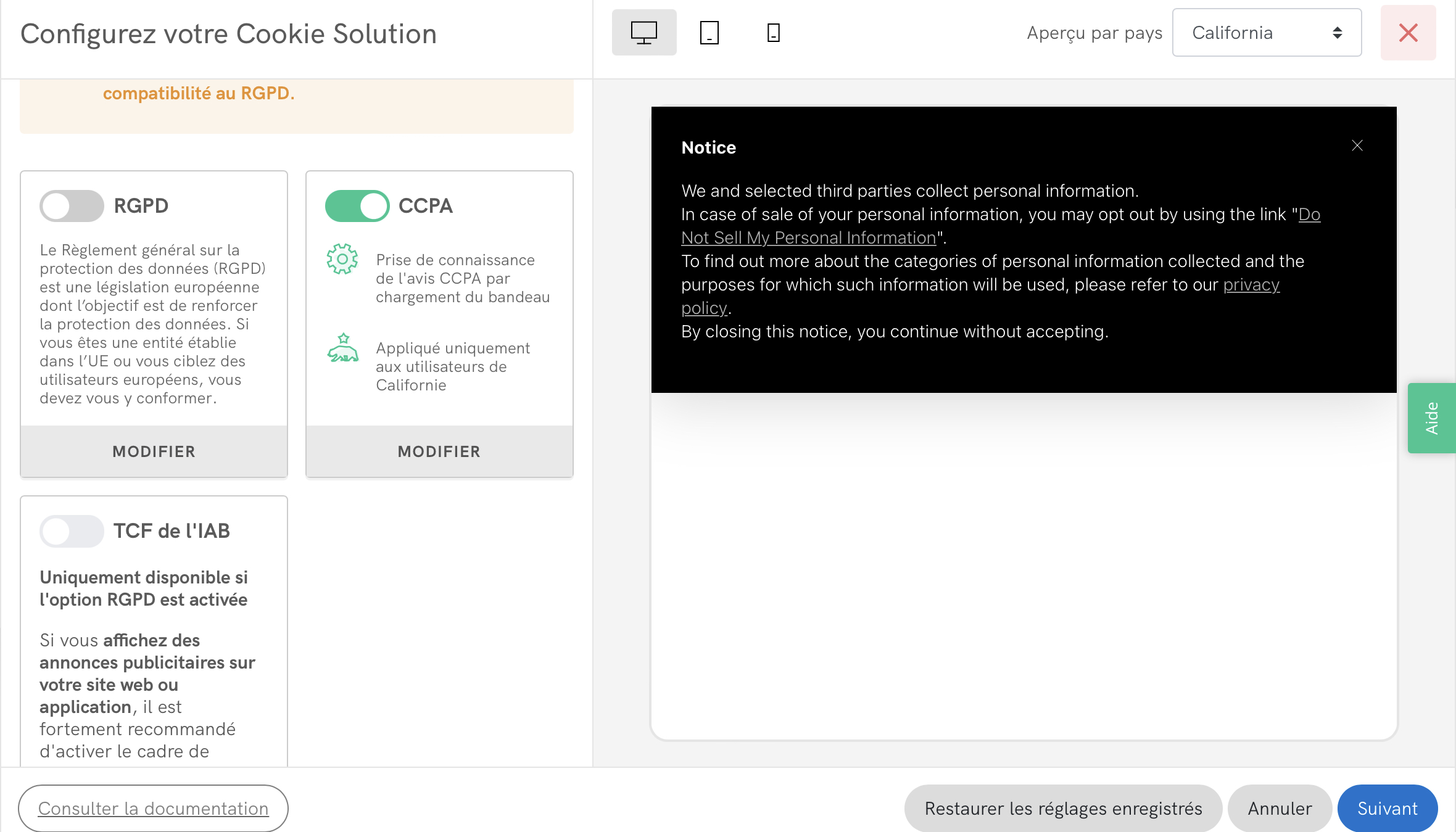 - d’assurer la compatibilité avec le CCPA Compliance Framework de l’IAB.