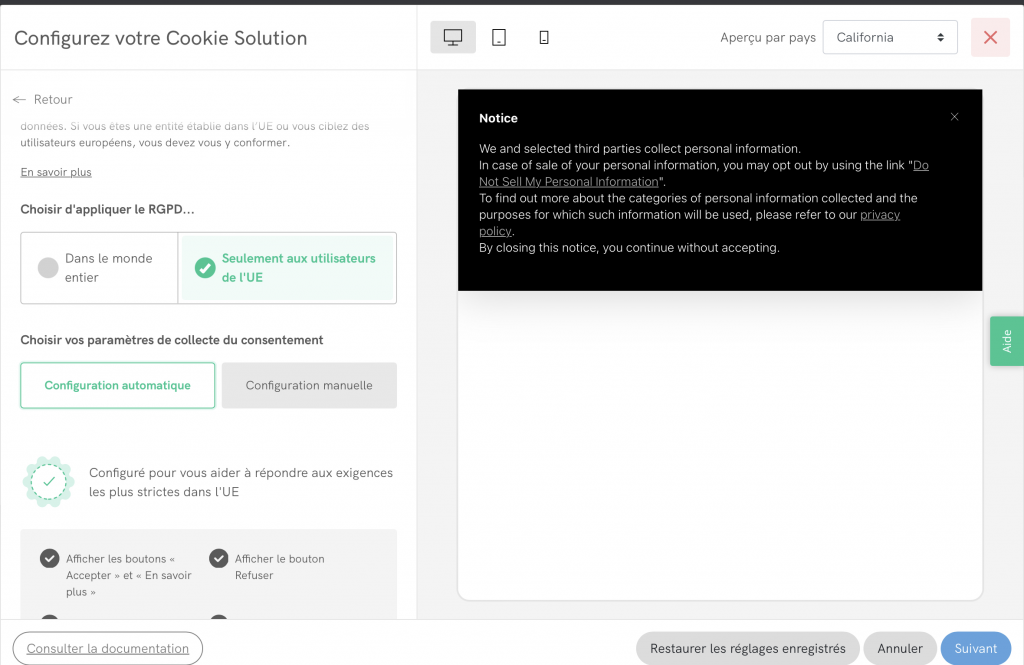 Notre solution vous permet d’afficher une notification pour informer les consommateurs californiens de la possibilité que leurs données soient collectées et de leur droit d’opposition. Cette notification affiche également un lien « Ne pas vendre mes Informations Personnelles » comme l’exige la loi.