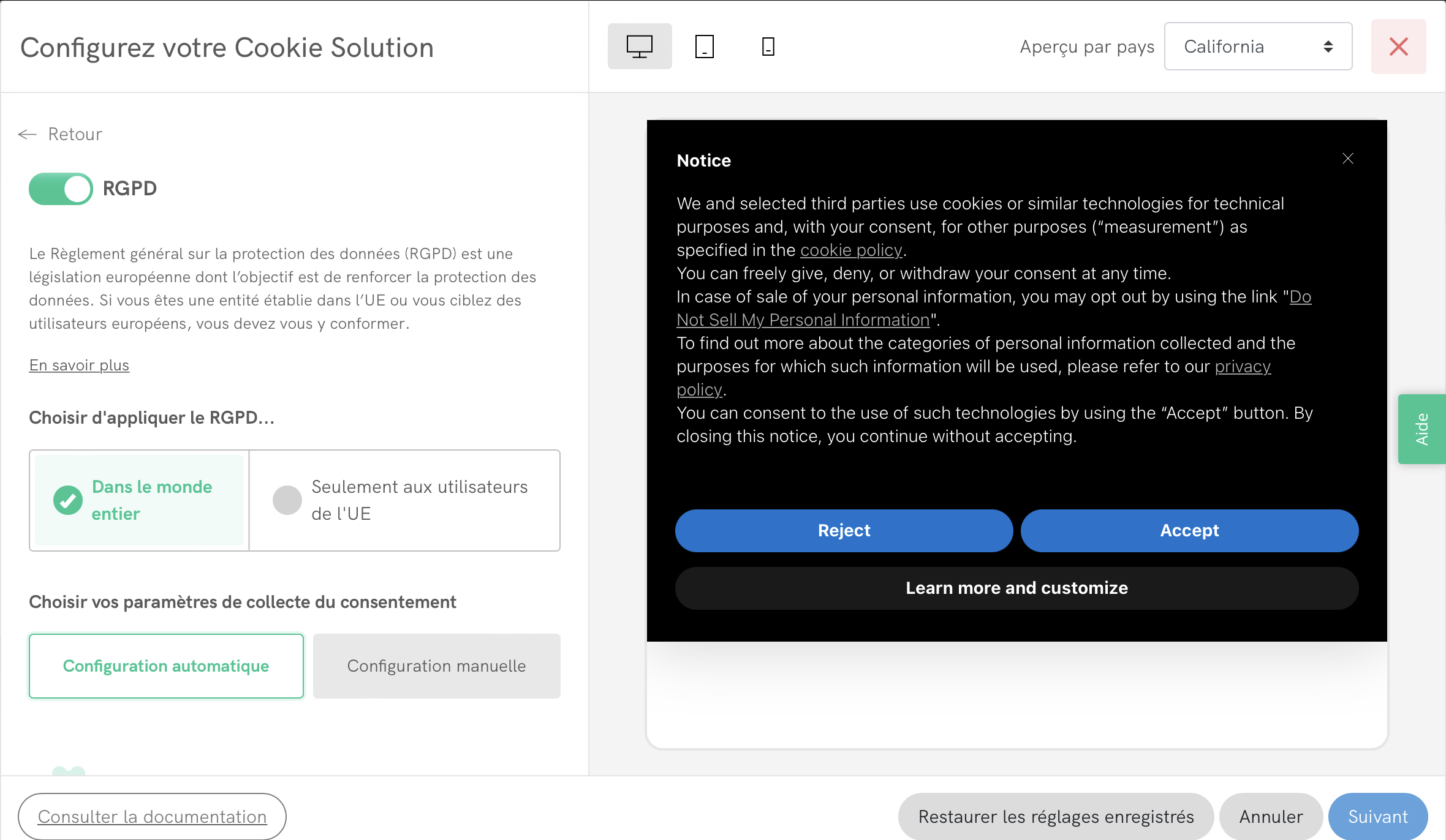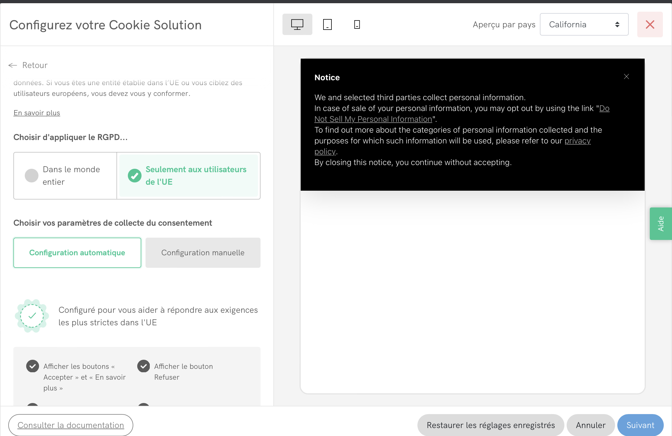 Grâce à la détection du pays, nous appliquerons les normes de la loi CCPA lorsque nous détecterons que l’utilisateur se connecte depuis la Californie et celles du RGPD lorsque l’utilisateur se connectera depuis l’UE. Sélectionnez « CCPA » et « RGPD », puis :