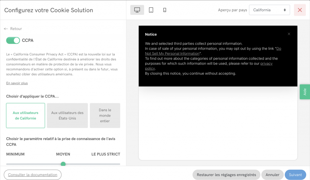 Si vous souhaitez appliquer les normes de la loi CCPA uniquement à vos utilisateurs californiens en détectant automatiquement les utilisateurs qui se connectent depuis la Californie et en n’appliquant les normes de la loi CCPA qu’à ceux-ci, sélectionnez « CCPA » puis dans « Modifier », sélectionnez « Aux utilisateurs de Californie » :