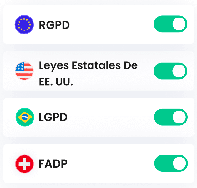 Cubrimos las principales leyes de privacidad del mundo, como el RGPD de la Unión Europea o del Reino Unido, la directiva ePrivacy (ley de Cookies) de la Unión Europea, la LGPD de Brasil, la FADP de Suiza y las leyes estatales de Estados Unidos.